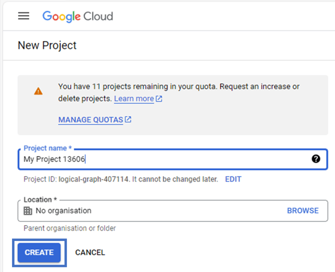 Give your project a name and click the CREATE button:
