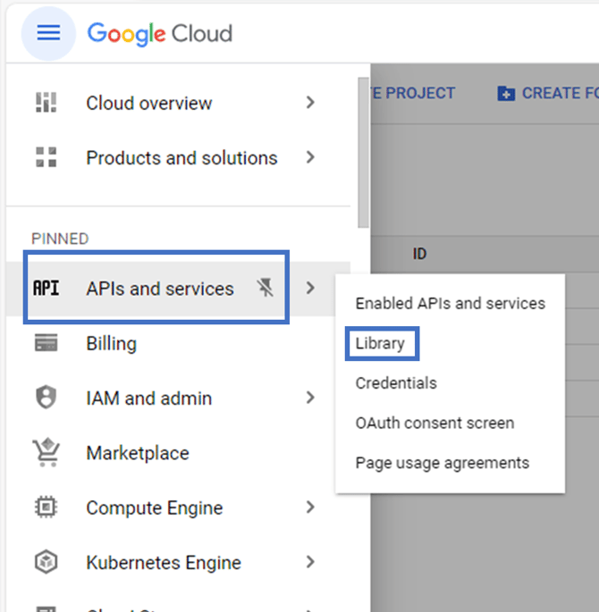 Now you’ve created your project, enable the Google Drive and Google Sheets API by clicking the “hamburger” icon (☰) in the top left corner, selecting APIs & Services > Library: