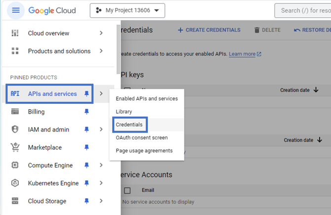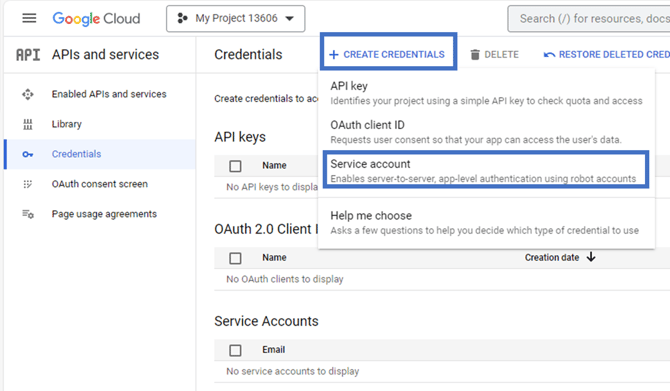 Then set up at the top of the page CREATE CREDENTIALS > Service Account: