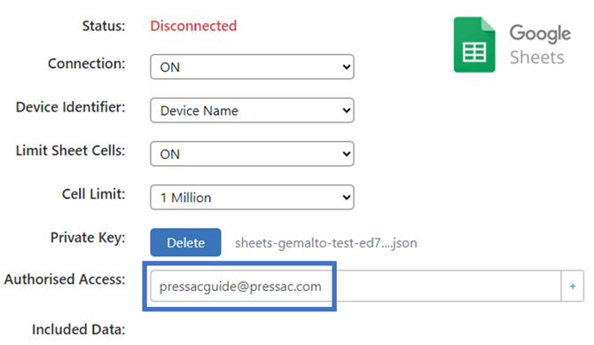 | Status | Status of the connection to Google Sheets, either Disconnected or Connected. |